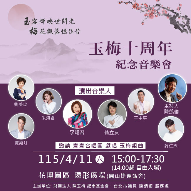 This commemorative outdoor concert presents live music performances in remembrance of Chen Yu-mei, a known for contributions to City Councilor and community development and social service.