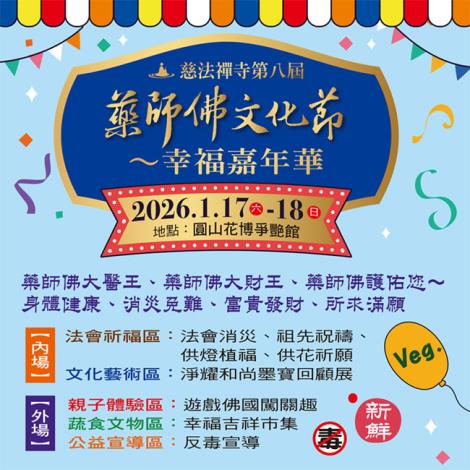 以佛教法會為核心,結合市集、展覽與座談,並設有親子互動區可一併參與。自由入場 佛教法會 市集 展覽 座談 親子互動活動資訊展期2026/01/17 – 2026/01/18時間08:00 – 20:00地點爭艷館、爭艷廣場入場方式自由入場 前往官方公告 活動內容佛教法會吉祥市集淨耀大和尚墨寶展淨耀大和尚追思座談會親子互動區-遊戲佛國常見問答這場展演活動主要包含哪些內容?佛教法會吉祥市集淨耀大和尚墨寶展淨耀大和尚追思座談會親子互動區-遊戲佛國適合帶小孩參加嗎?現場設有親子互動區「遊戲佛國」,可依家庭需求安排參與。